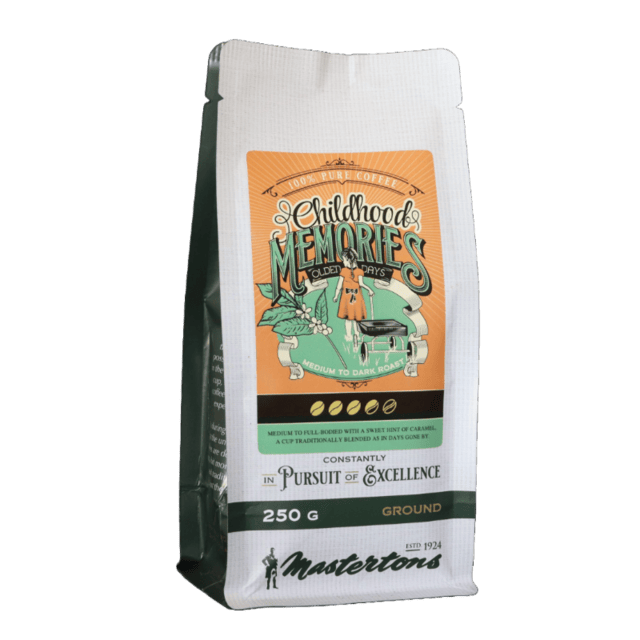 The label says it all - a reminder of the 'good old days'! The Mastertons Childhood Memories Coffee Blend is a slightly stronger than medium blend. Contains medium-roast as well as a small percentage of dark-roast beans. Medium to full-bodied liquor with a slight caramel taste.