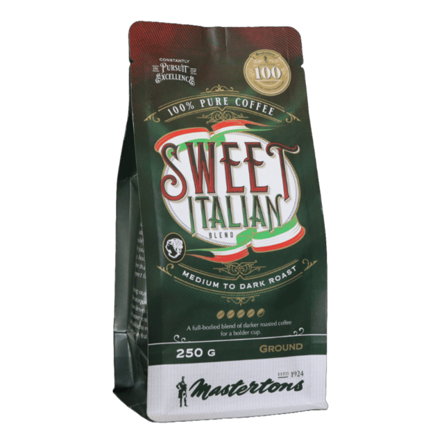 Sweet Italian is typically Latin, strong but not bitter. A superb after-dinner coffee blend for those requiring a lift! The perfect blend of dark and medium roast coffee beans. Used extensively in Italian stove-top espresso pots.
